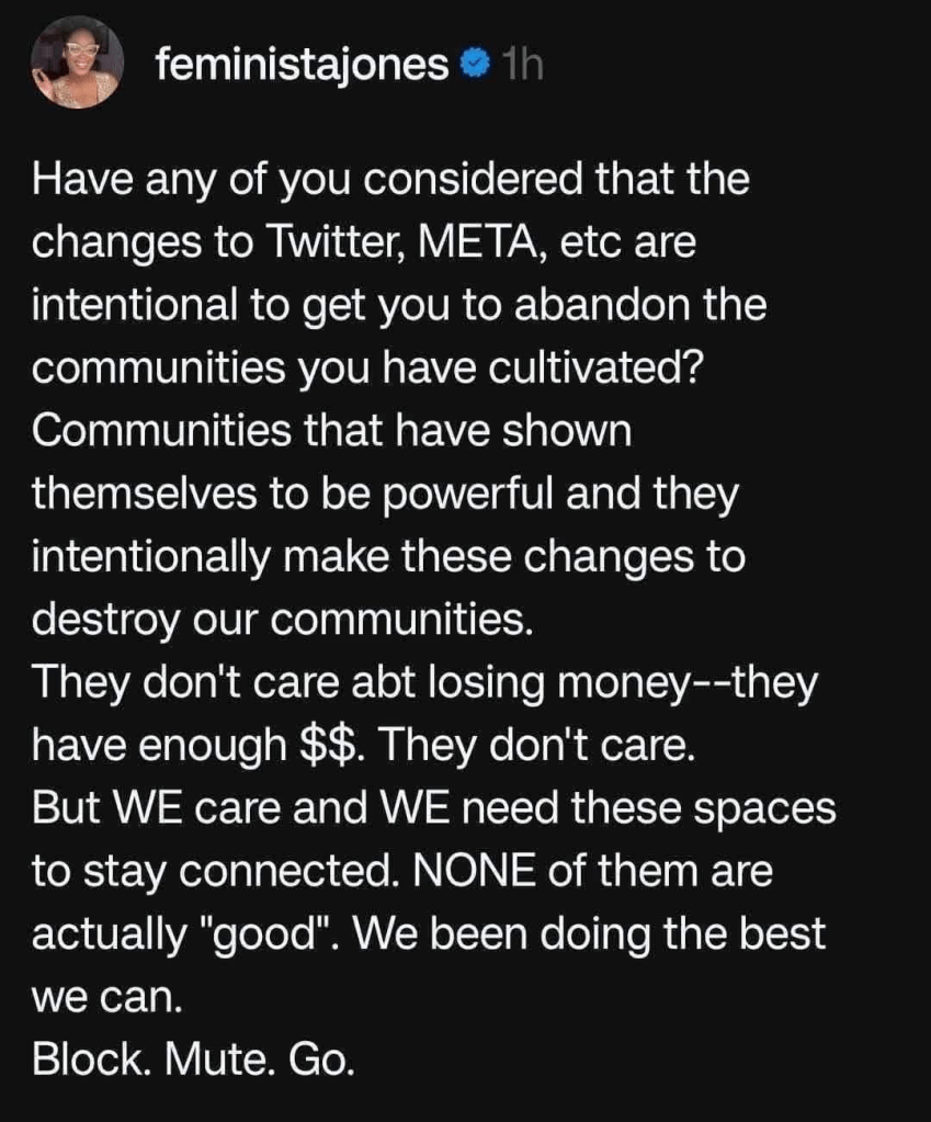 I didn’t agree with the entirety of it: The rich and powerful, as far as they are concerned, never have enough money. But she made one valid point that resonated with me: “Communities that have shown themselves to be powerful …. WE need these spaces to stay connected. NONE of them are actually ‘good.’ We been doing the best we can. Block. Mute. Go.”